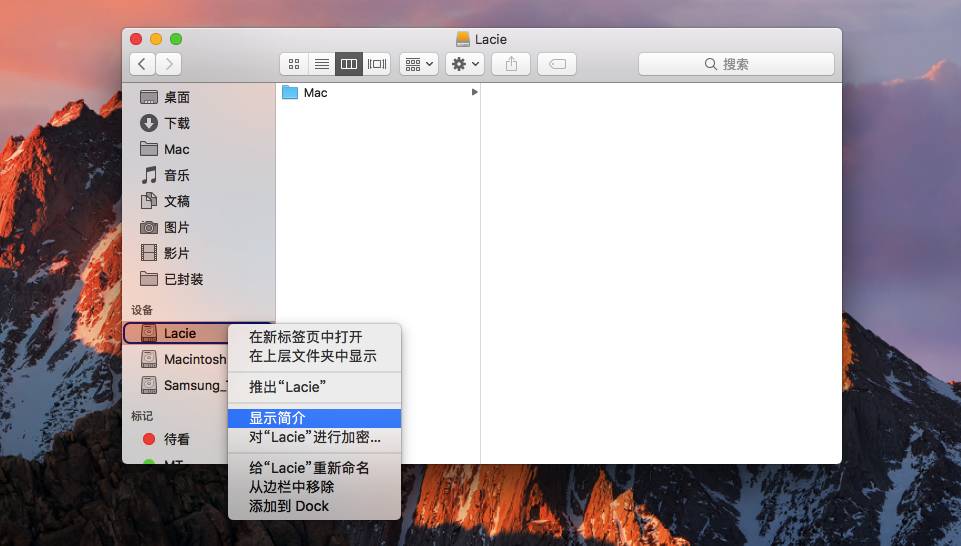 在 Finder 边栏选中硬盘,右键 - 显示简介(或者按 command + i );