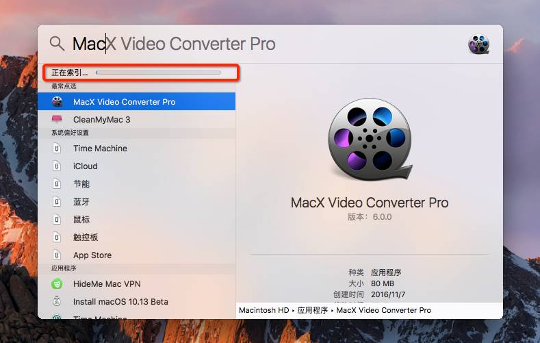 命令执行完毕后,通过快捷键或者点击菜单栏中的 Spotlight 按钮,呼出 Spotlight,随便输入一个词,就能看到提示:正在进行索引...,完成之后,Spotlight 就可以运转如飞了。
